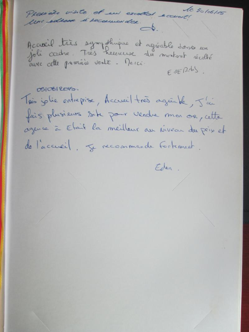 Au sein de notre agence d'achat d'or Paris vous disposez d'un livre d'or sur lequel écrire votre avis. Nous le transcrivons à l'identique avec votre accord sur le site "Quel Rachat d'or".